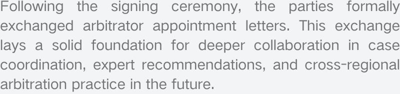签署仪式后,各方正式交换仲裁员聘书,为未来在案件协调、专家推荐及跨区域仲裁实践方面的深度协作奠定了基础。