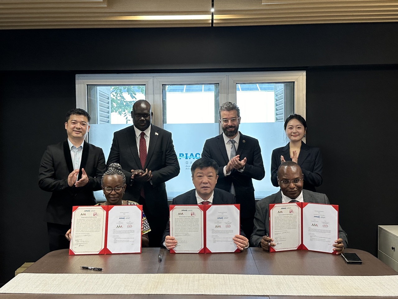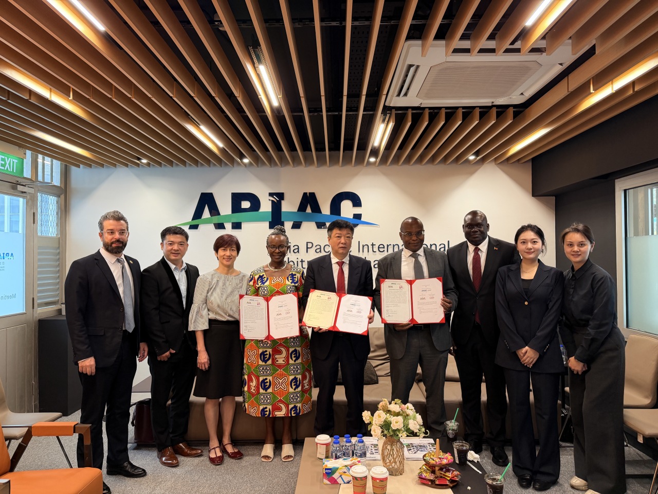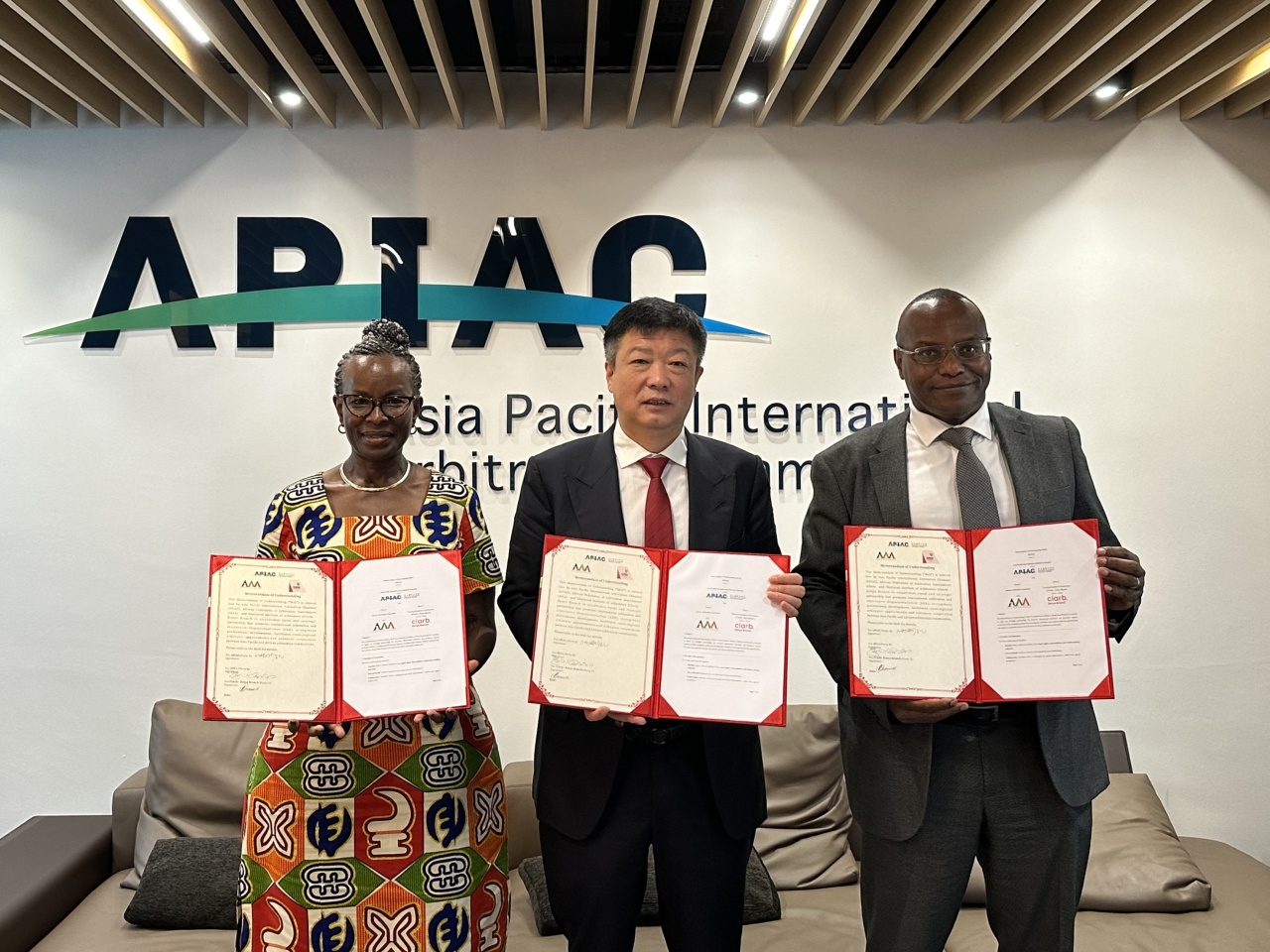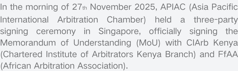 2025年11月27日上午,亚太国际仲裁院(Asia Pacific International Arbitration Chamber, APIAC)在新加坡举行三方签署仪式,与英国特许仲裁员协会肯尼亚分会(Chartered Institute of Arbitrators Kenya Branch, CIArb Kenya)及非洲仲裁协会(African Arbitration Association, AfAA)正式签署《战略合作谅解备忘录》(MoU)。
