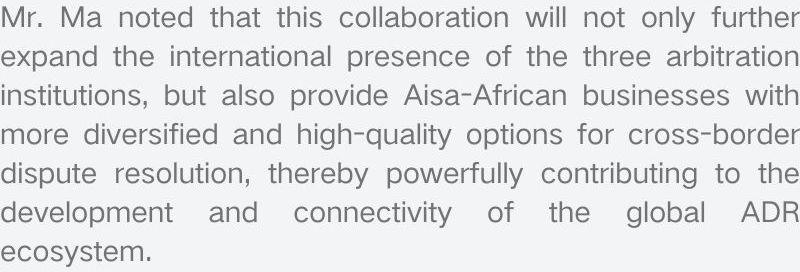 马占军主席表示,此次合作不仅将进一步拓展三地仲裁机构的国际影响力,也将为亚非企业跨境争议解决提供更多元且高质量的选择,有力推动了全球ADR生态的发展与互联互通。