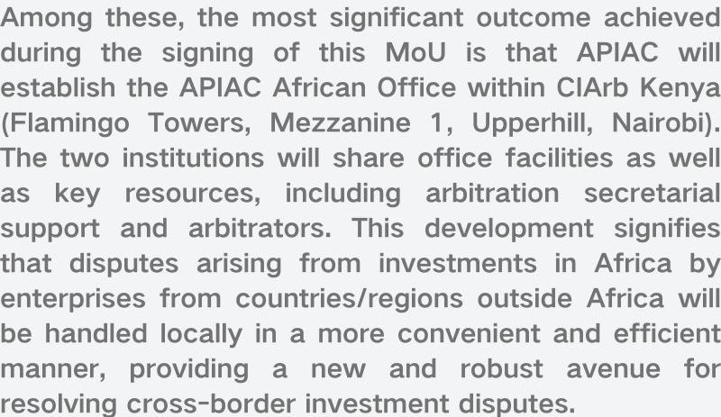 其中,三方在此次签署过程中,达成的最重要成果是:APIAC将在CIArb Kenya(Flamingo Towers, Mezzanine 1, Upperhill, Nairobi)设立APIAC非洲办公室。双方将共享办公设施,仲裁秘书和仲裁员等重要资源,这标志着非洲以外国家/地区企业在非洲投资所发生的纠纷将能在非洲当地获得更为便捷、高效的服务,为解决跨境投资争议提供了新的有力途径。