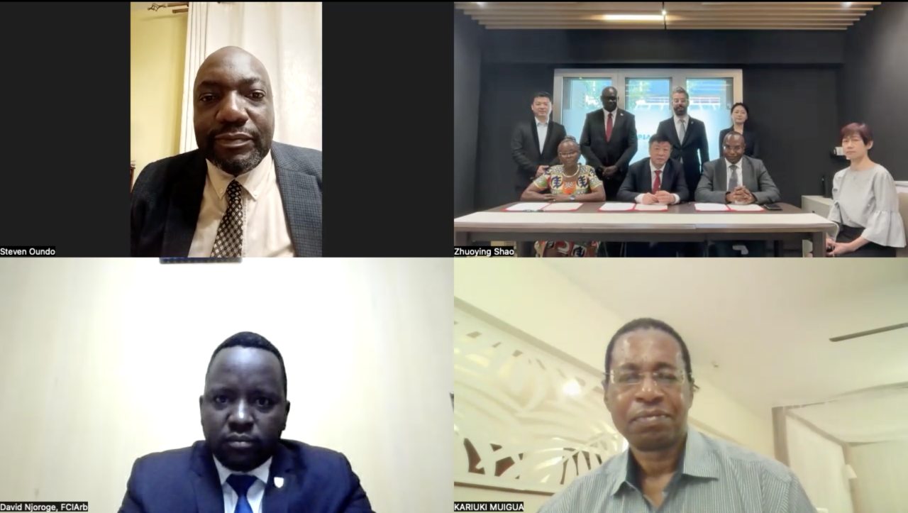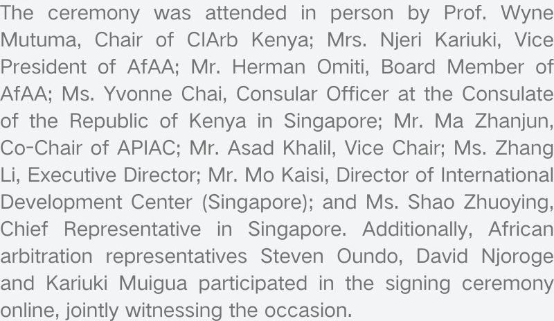 CIArb Kenya主席Wyne Mutuma,AfAA副主席Njeri Kariuki, 会员Herman Omiti,肯尼亚驻新加坡领事馆领事官员Yvonne Chai,亚太国际仲裁院联席主席马占军、副主席Asad Khalil、行政总监张丽及新加坡发展中心主任莫凯斯、首席代表邵卓颖出席本次仪式。此外,非洲仲裁代表Steven Oundo, David Njoroge及Kariuki Muigua同步线上参会,共同见证此次签署仪式。