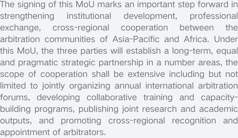 此次MoU的签署标志着亚太与非洲仲裁界在制度建设、专业交流与跨区域合作方面迈出重要一步。根据MoU,三方将建立长期、平等、务实的战略合作关系,合作范畴广泛,涵盖共同举办年度国际仲裁大会、开发联合培训与能力建设项目、发布联合研究及学术成果、推动跨区域仲裁员互认与任命等多个方面。